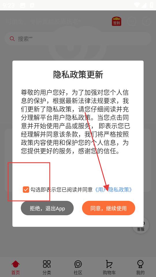 2、点击商品进入详情页,进入隐私政策更新页,勾选同意条款,点击同意继续使用。