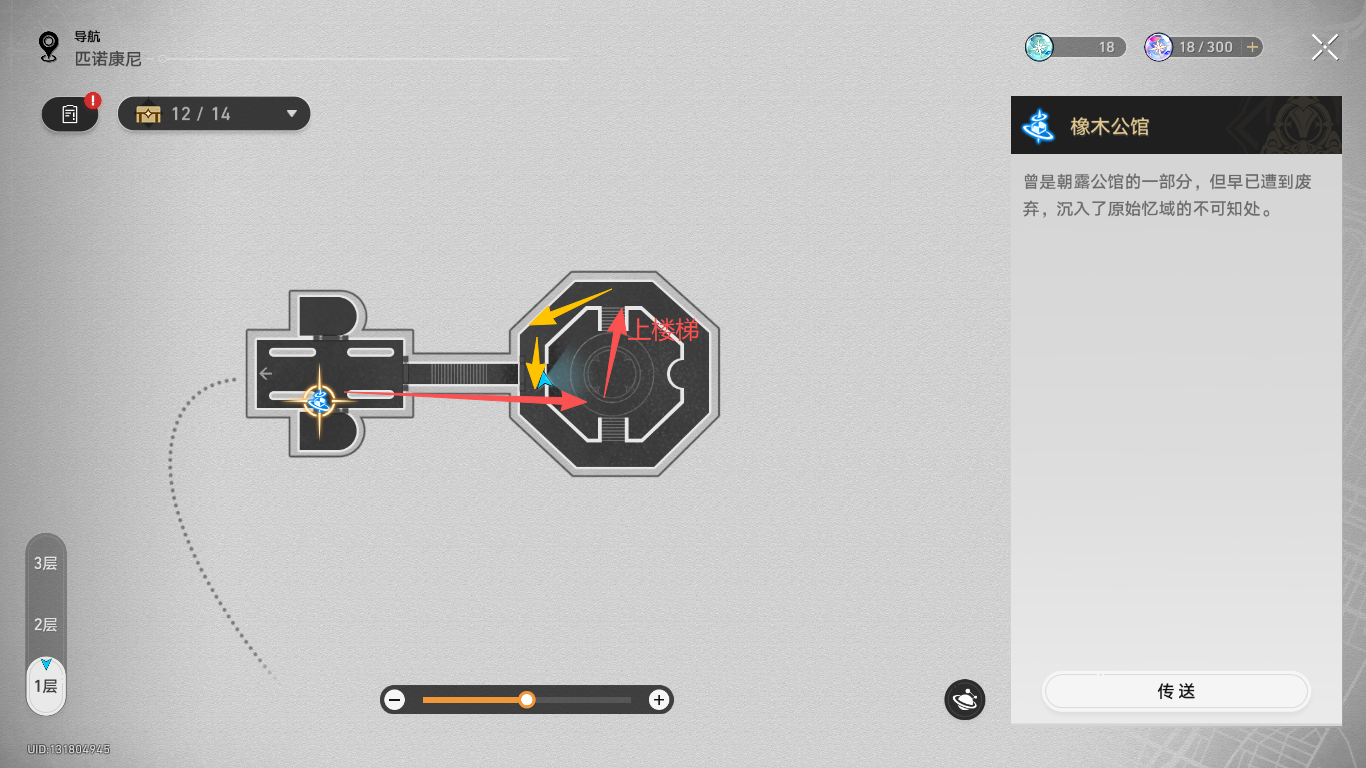 传送到橡木鸣蛀之梦地图右上角的【橡木公馆】锚点,按照如下路线上到公馆二楼