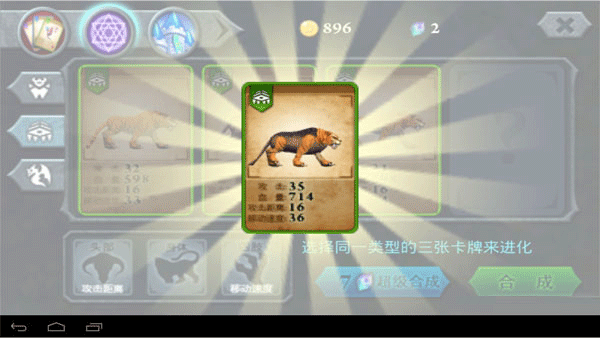 2、接着点击上面多面体紫球,进行合成,无尽之战左边三个选项卡是三个属性分类,第一个是直立行走的动物,第二个是爬行动物,第三个是飞行动物,因为每次合成至少要三个动物,并且这三个动物必须属于同一种类型,所以我们先来合成老虎犀牛老虎。