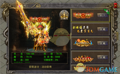 2、给各位勇士介绍些特色的武器及服饰吧!武器部分,饮血狂刀,渴望鲜血,收纳灵魂,可通过开服活动的时装升级获得。涯角龙魂枪,怒斩雪翼雕的利器,可通过游戏活动获得,对攻击、生命、切割等属性均有加成。服饰部分,机甲战神装扮,来自未来的战士,科技代表力量,可通过首充获得,能使激活攻速提升25%。