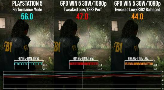 综合测试表明,当GPD Win 5连接电源以“底座模式”高功耗运行时,确实能提供接近PS5的强劲性能。而在30W左右的移动功耗下,凭借其1080p VRR屏幕与FSR超分辨率技术,同样能在《心灵杀手2》这类3A大作中获得流畅且画质可接受的高帧率体验,实现了性能与便携性的出色平衡。