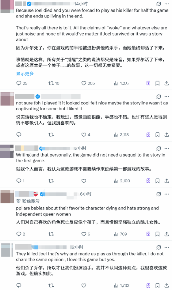在数千条回复中,获得最高共识与点赞的观点,直指续作颠覆性的剧情走向。一位网友尖锐总结道,核心原因在于“乔尔死了,而且游戏强迫你用杀害他的凶手玩了半个游戏,最后那个凶手居然还活了下来”。这种叙事设计被许多系列老玩家视为一种“背叛”,他们期待的是围绕乔尔与艾莉的传统“英雄之旅”,而非一个以悲剧和复仇循环开篇、并迫使他们共情对立面的故事。