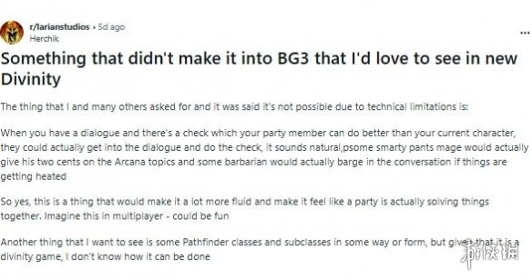 玩家指出,类似机制在其他CRPG(如《开拓者:正义之怒》和《索拉斯塔》)中已有成功实践。不过,挑战在于如何将其与拉瑞安标志性的电影化、高沉浸感的对话演出相融合,避免打断叙事节奏。