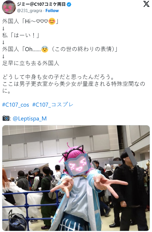 Coserジミー(@231_gragra)表示,自己cos了《LoveLive!虹咲学园学园偶像同好会》中的天王寺璃奈,带着自制的“小璃奈板”并穿上服装出角。在会场被一名外国参加者以“Hi~♡”热情打招呼,于是自然回应“嗨~!”,没想到对方却瞬间露出宛如世界末日般的震惊表情,低声说了句“Oh……”后便快步离开,让Coser忍不住吐槽:“到底为什么会以为我里面也是女生?”
