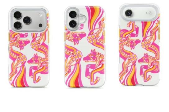 设计上,保护壳从骏马所象征的活力与灵动中汲取灵感,采用粉、红、橙、黄等色彩交织而成的渐变配色,借助陈粉丸对传统中国剪纸艺术的当代诠释,生动传递出浓郁的节日气息。