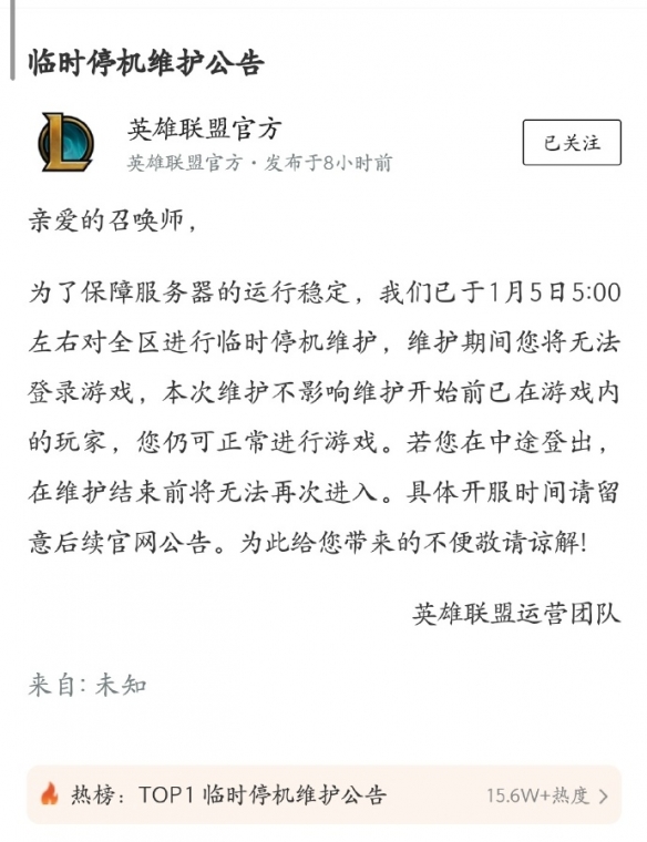 今天下午15时,《英雄联盟》官方网站发布公告,本次临时停机维护已结束,目前全区均已恢复正常,玩家可以正常登录并体验游戏。