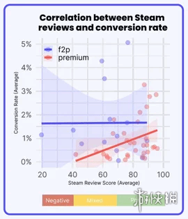 报告揭示了一个有趣但合理的反差:对于免费游戏(F2P),Steam评分的高低对其下载转化率“没有可衡量的影响”。因为零门槛决定了玩家的试错成本为零,“先下载试试”是普遍心态。