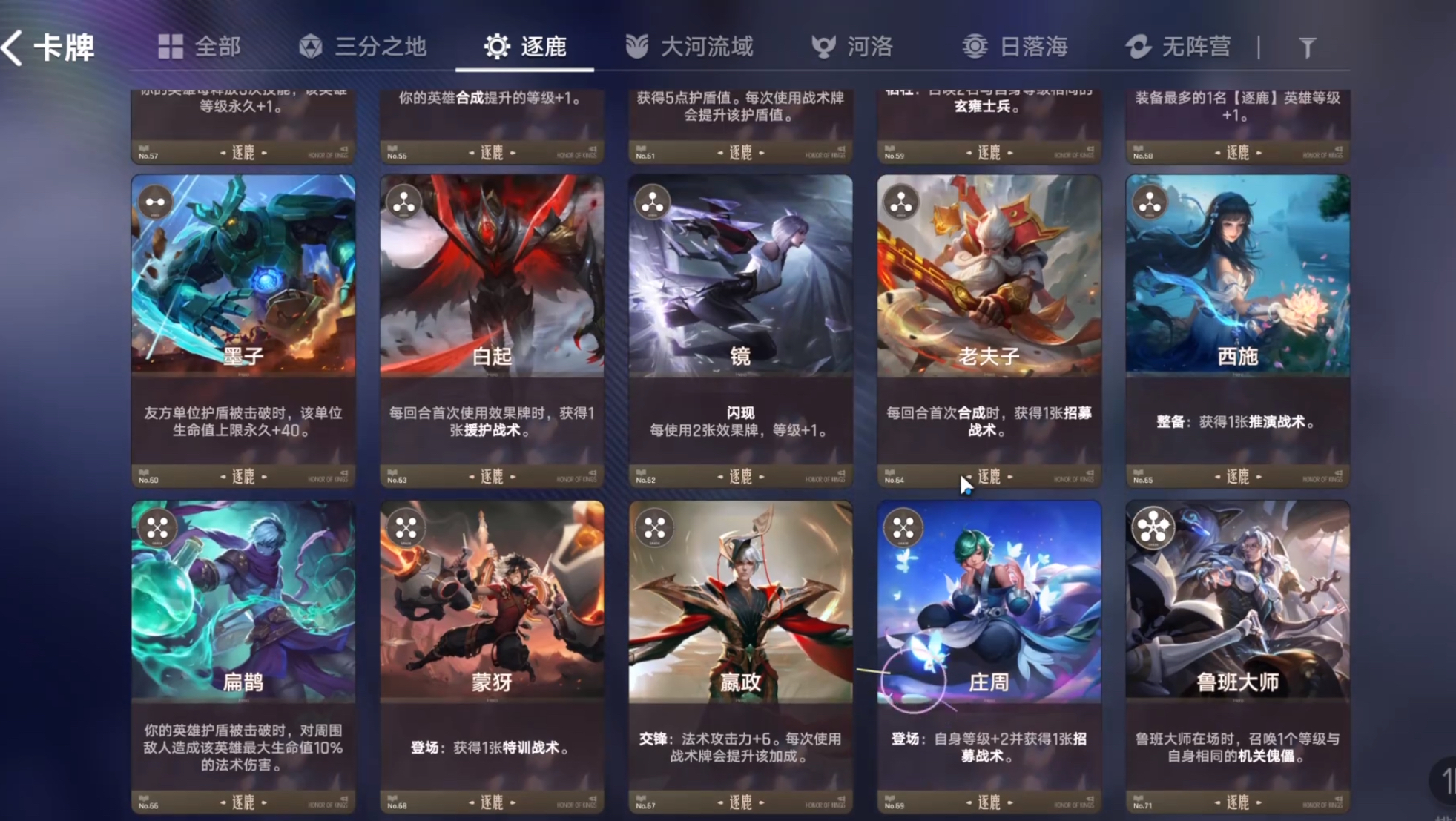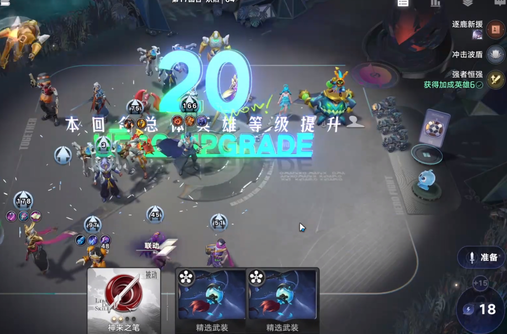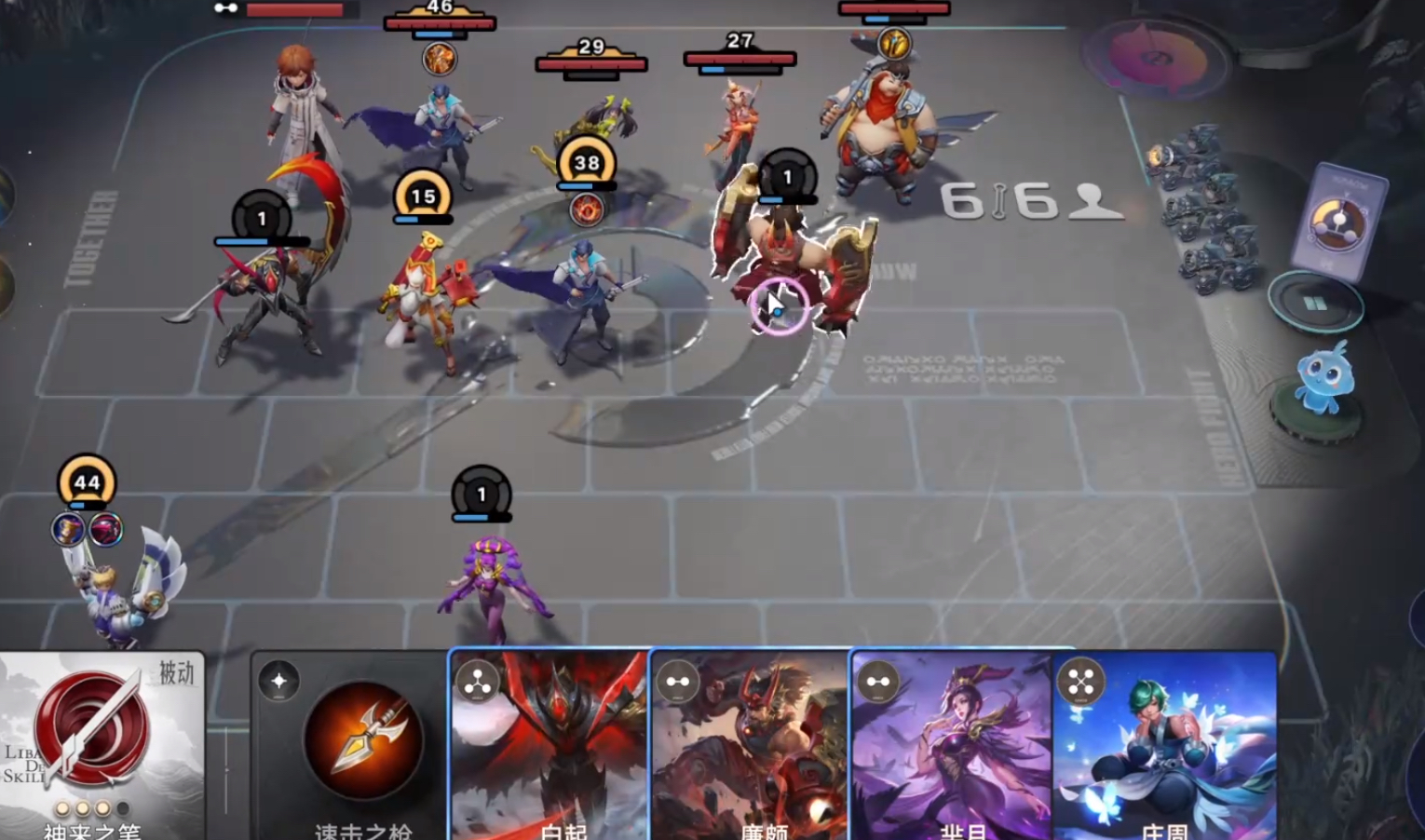 之后我们的核心就是觉醒耀和孙膑,其他的不相关的棋子可以不用着急升级。等到第一次拍卖的时候就可以找老夫子和白起这两张牌了,如果没有这两张牌那就随便拿一张效果牌过渡。如果你手上这四张牌都有了那么就可以开始启动阵容了。这里的站位安排就是孙膑在后排,其他三位在第一排,之后就可以开始刷商店,拿牌,比如境,芈月等逐鹿阵容的牌。到了第二次拍卖的时候,就可以开始找四费和五费卡牌了。