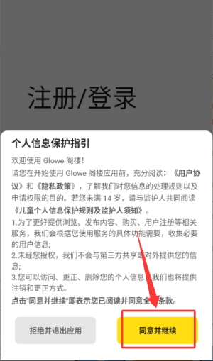 1、点击Glowe阁楼中的“同意并继续”进入注册和登录界面。
