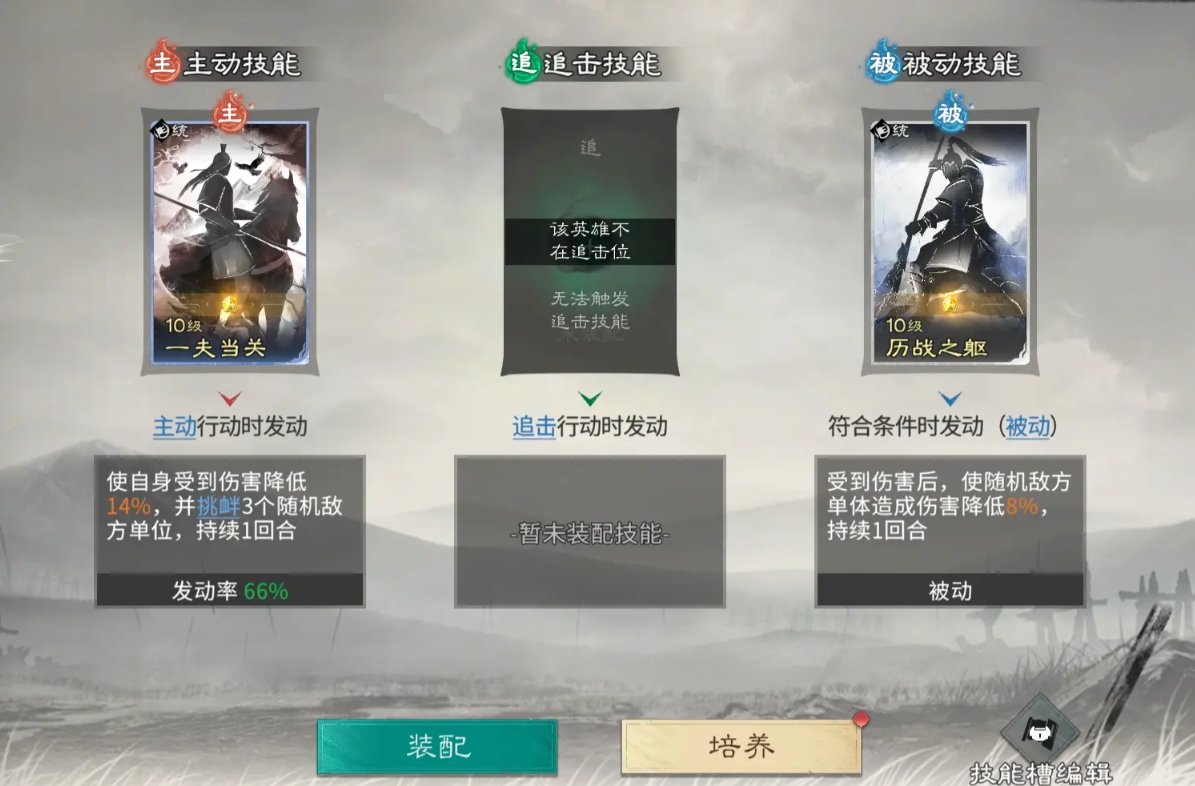 在技能装配策略上,“一夫当关”因其兼具减伤与挑衅双重效果,成为董卓最优主动技能选择,建议优先配置于主动技能位;若存在追击格,则同步装备于追击技能栏以强化控场频率。被动技能推荐“万战之躯”,可对攻击董卓的敌方单位施加伤害降低效果,进一步巩固其前排生存能力与抗压强度。阵容构建方面,经典组合如吕布+貂蝉+董卓,依托高爆发与连携控制形成速攻闭环;另一主流体系为董卓+诸葛亮+贾诩,以多层控制链与策略型减益覆盖战场,兼顾稳定性与压制力。