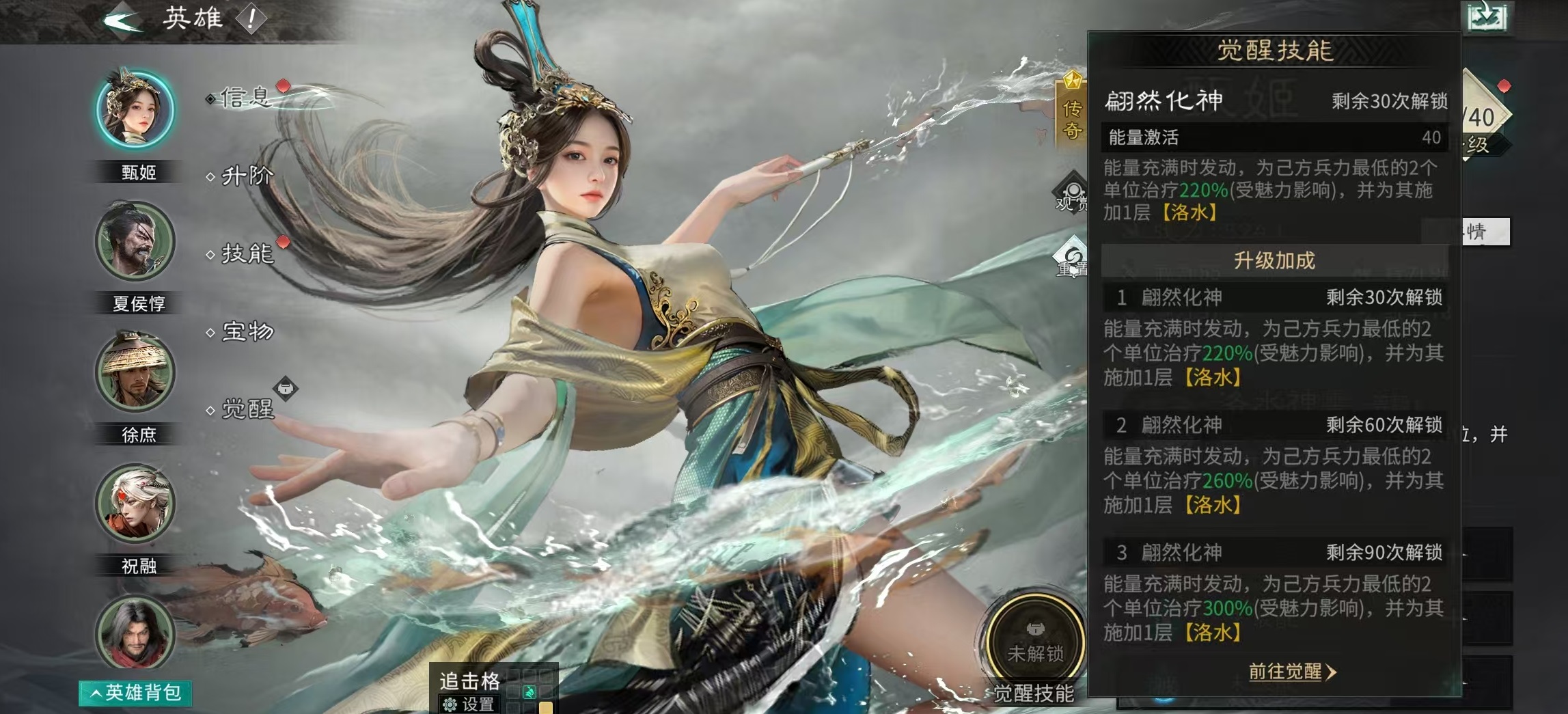 甄姬为传奇品质治疗型辅助武将,基础定位明确——以持续续航与生存强化为核心职能。其天赋技能可在主动释放后,对追击格内单位实施治疗,并同步提升目标闪避率;完成觉醒后解锁专属觉醒技:当能量满格时,自动为己方兵力百分比最低的两名武将施加治疗,并附加“洛水”状态。该状态属叠加型增益,每层提升5%闪避率,持续两回合,且无层数上限,可随战斗进程不断累积,显著强化队伍整体容错能力。
