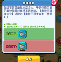 奥特王冠(3/3):如若在事件2中没有将皇冠升为3星,则可以在事件3中选择“再次充能”,将“奥特王冠”升级为3星,消耗60点能量。