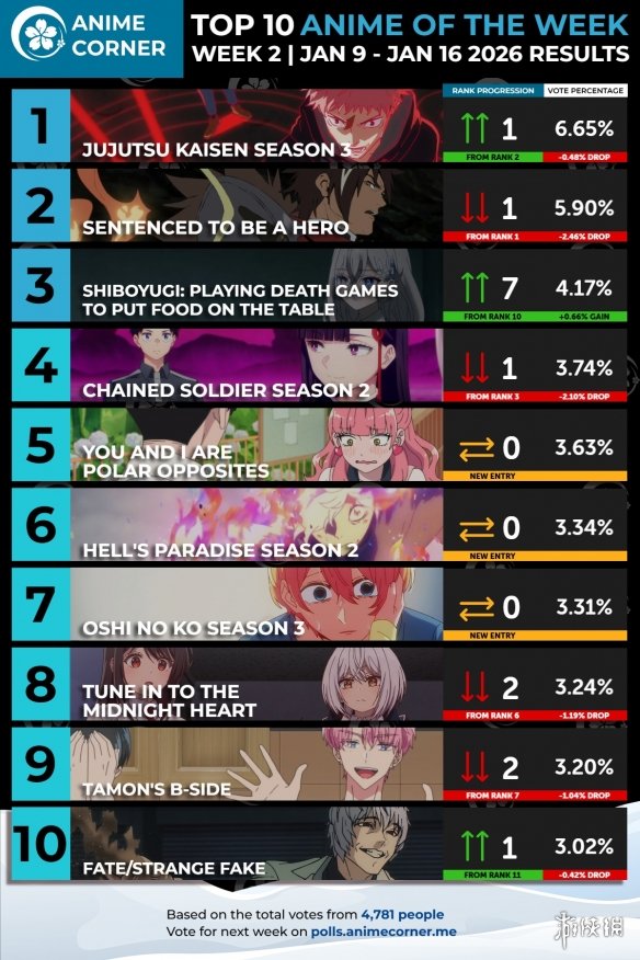 2026年1月已至月中,大部分新番动画都已经开播了,《咒术回战 第三季》、《我推的偶像》等开播前热门作品顺利冲上了热度榜单之中。