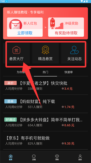 2、进入应用主界面,点击悬赏大厅入口浏览任务列表。