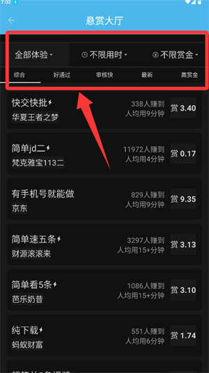 3、在悬赏页面,可根据用时、赏金等条件筛选合适任务。