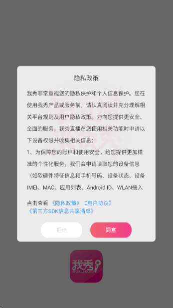 1、同意用户协议进入我秀软件。
