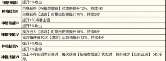 神格技能的解锁顺序也是比较关键的,神格I可以提升5%的攻击,在实战的过程中,可以将它放在中后排的位置,可以保证输出的安全,还能及时的支援队友。搭配大天使还有太阳神时,就可以借助队友的增益效果去强化自身的输出。抓住敌方阵型密集的时刻去释放奥义技能,就能一瞬间打乱对方的节奏。靠着二刀流技法的传承,让他在60多次战场中从来都没有失败过,所以这一个传奇的存在,大家一定不要过于的忽视。需要合理的利用技能机制,才能在战场上复刻这一份荣光。