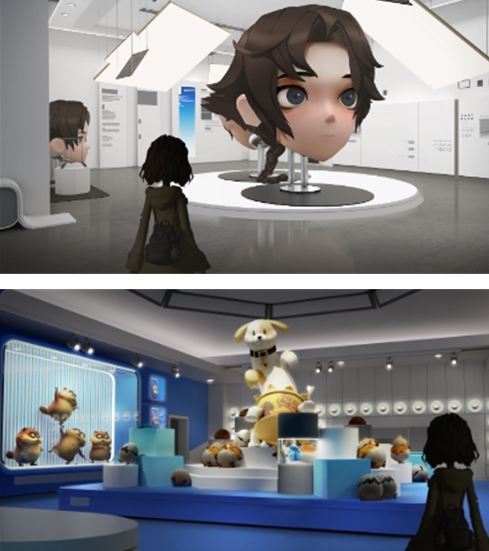 未来空间中有一些萌趣十足的房间,有的摆有工友模样的巨型人头像,点击切换还可以换成你自己的头像,有的被巨型萌猫占据。