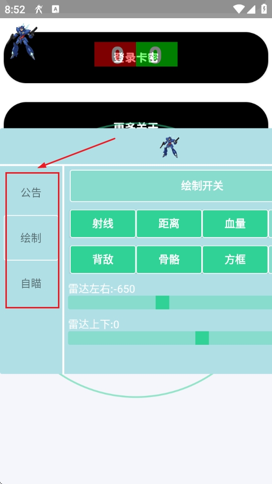 3、我们也可以通过绘制功能来设置射线、距离、血量、名字、背敌等选项的设置。
