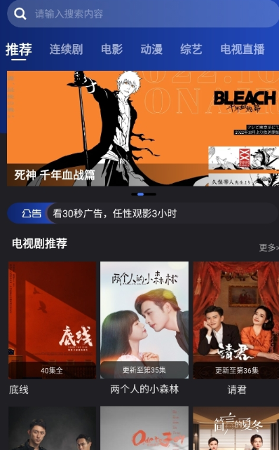1、打开软件进入首页,可见推荐、连续剧等分类标签,浏览各类影视推荐内容。