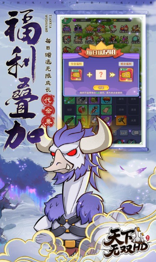 《天下无双HD》 是一款玩起来非常休闲轻松的挂机手游,还有免费福利可以领取。在游戏中,玩家可以操控魔法鹅击败场景中的各种敌人,同时也可以培养它们。玩家还可以打造一些强大的装备和武器,游戏风格非常神奇。使用开箱获得的经验、装备和各种武器进行战斗,还可以与其他玩家组队进行冒险。游戏中还有联盟机制,可以加入或创建联盟,体验不同的游戏。操作简单,还支持离线游戏,享受一个简单轻松的游戏世界。