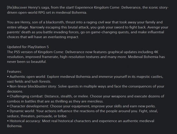尽管战马工作室去年曾明确表示暂无回归初代作品的计划,但近期多项迹象指向《天国:拯救》本世代主机强化版本已箭在弦上。据Gematsu报道,该作PlayStation商店页面描述已悄然更新,新增“已为PlayStation 5更新”的标注,成为版本升级最直接的佐证。