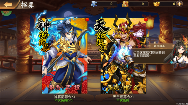 2、玩家可以进行神将、天金两种类型招募。