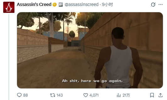 本周,一款爱德华·肯威手办照片在社交平台流传,因造型异于原版,被猜测与《黑旗》重制版相关。《刺客信条》官号未正面回应,反而晒出《GTA:圣安地列斯》CJ台词截图“啊,见鬼,又来了”,以幽默方式回应,被解读为变相默认。