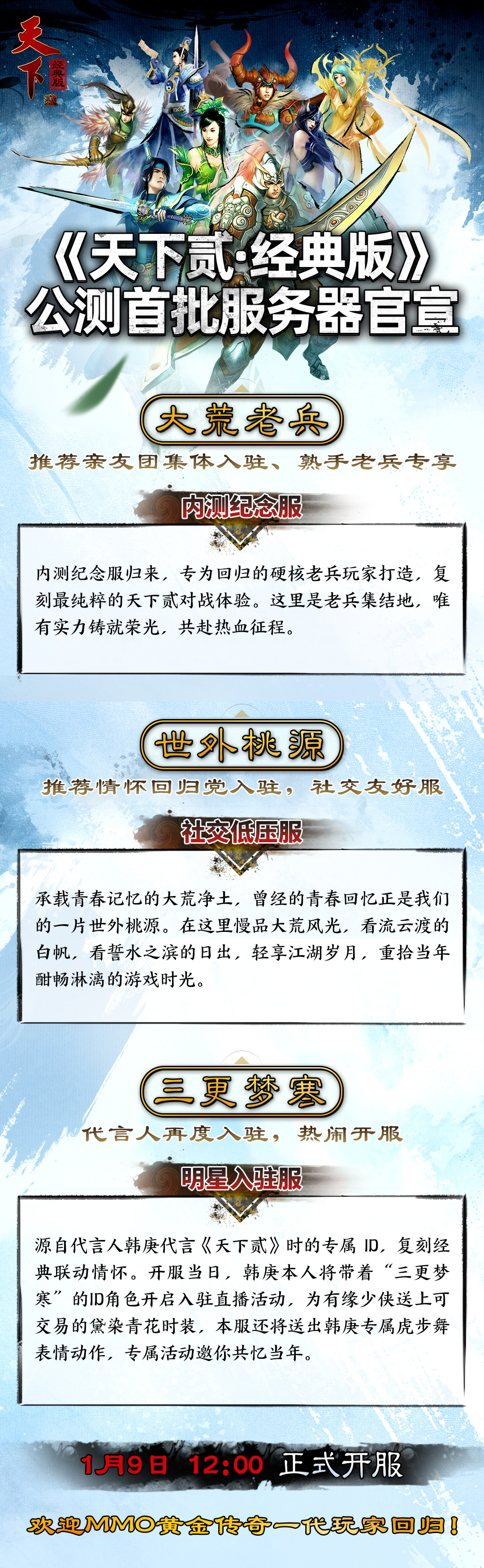 福利已备妥,江湖已敞开,1月9日12:00,让我们在天下贰经典版的世界里,不见不散!