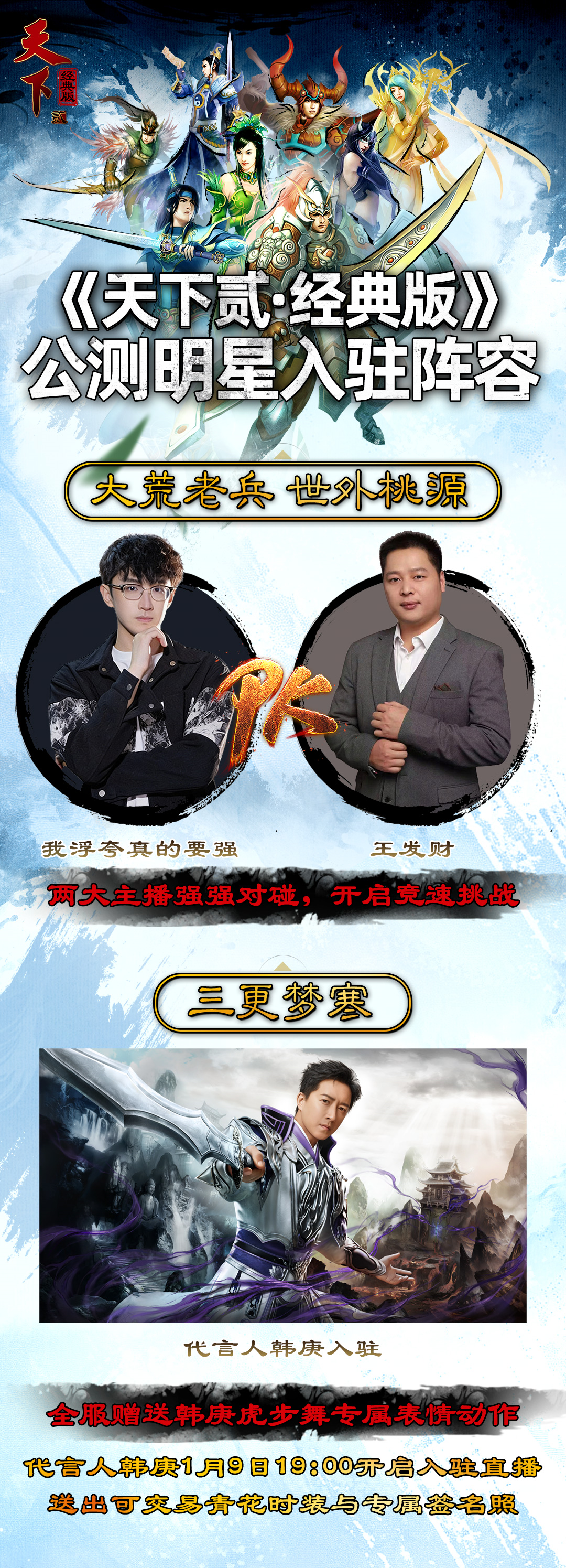 韩庚公测入驻“三更梦寒”服务器,时隔15年回归大荒首播,现场送出可交易青花玄素、亲笔签名照、玉玑子雕像等豪礼!1月9日19:00,锁定天下:万象官方抖音直播间,与韩庚共赴大荒之约~