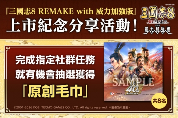 光荣特库摩参展「2026台北国际电玩展」,即日起至2月1日(日)为期四天,于台北南港展览馆1馆热闹展开!于光荣特库摩摊位购买『三国志8 REMAKE with 威力加强版』游戏,即可获得「Kou Shibusawa签名海报」一张,每日限量3名与「限定原创徽章」一个。于社群公开分享感想更加码赠送「三国袖珍春联贴」!