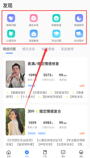 2、发现页面涵盖了情绪困扰、婚姻关系和抑郁症等专业心理咨询内容。