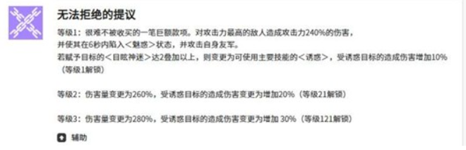 会锁定敌方攻击力最高的目标,造成攻击力240%的伤害。这个技能特别适合用于针对敌方的核心输出角色。技能命中时会为敌人附加“魅惑”减益效果,持续6秒。若目标身上的“目眩神迷”层数达到两层以上,洁依德的技能效果会发生变更,其主动技能“诱惑”对受该状态影响的敌人造成的伤害会提升10%。