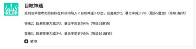 洁依德的被动能力目眩神迷是其状态体系的核心。受到此状态影响的目标,在10秒内会持续生效,每层效果会使目标的回避值减少2点,暴击率降低3%。该效果最多可叠加五层,使得敌人在被叠加后,生存和反击能力大幅下降。