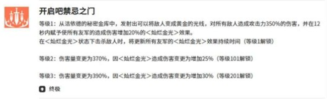 威力强大。洁依德发射一道黄金光线,对敌人造成350%攻击力的伤害,并在接下来的12秒内,使所有敌人受到“灿烂金光”的影响。处于“灿烂金光”状态下的敌人被我方攻击时,若被击杀,则会刷新所有敌人身上的“灿烂金光”效果持续时间,在此期间,角色造成的伤害会显著提升。此外,若将洁依德设置为队长,且队伍中的精灵角色与她的阵营相同(例如塔利亚、玛依),则有50%的概率触发额外效果,使全队的攻击力、魔法恢复速度及体力上限均提升50%。