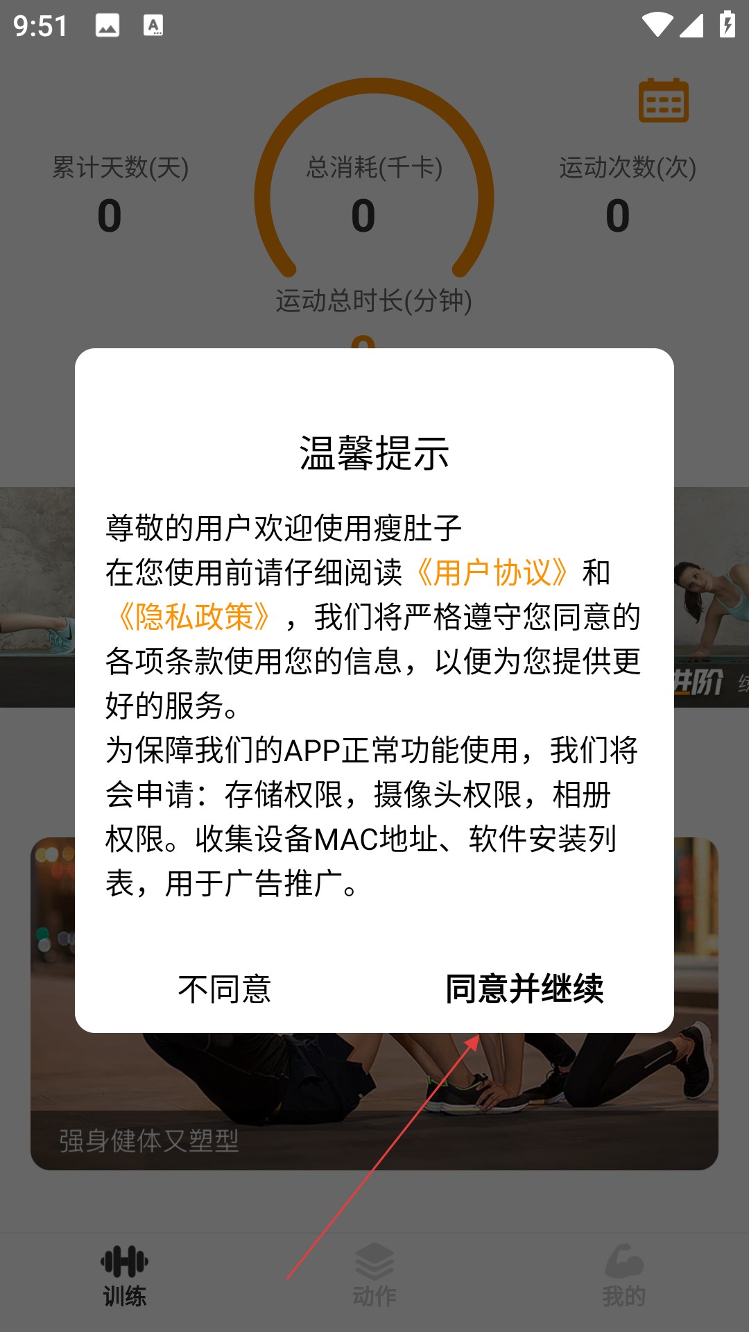 1、要使用减肥腹部,您需要首先阅读温馨提示,了解用户协议和隐私政策,了解许可申请情况,同意并继续,如果您不同意,请选择不同意。