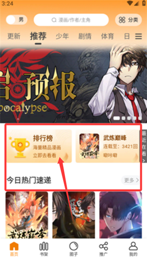 2、首页设有排行榜等入口,点击即可浏览平台精选漫画作品。
