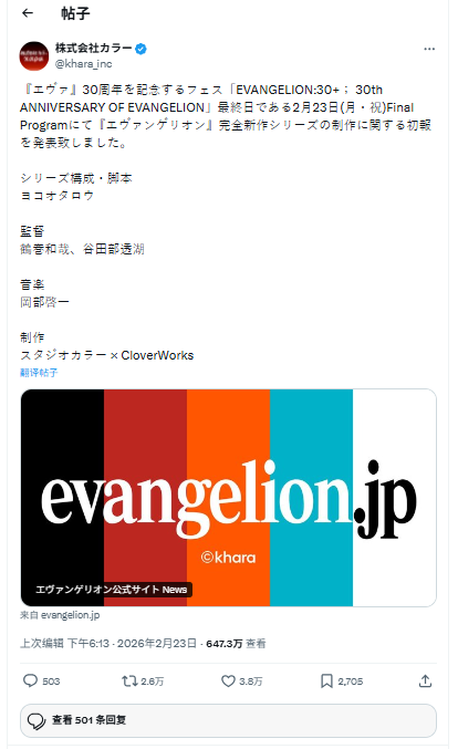 在《新世纪福音战士》30周年纪念活动「EVANGELION:30+; 30th ANNIVERSARY OF EVANGELION」最终日,官方正式宣布将启动《新世纪福音战士》完全新作系列。这是继2021年《新世纪福音战士新剧场版:终》为旧系列画下句点后,官方再度开启的大型影视计划。