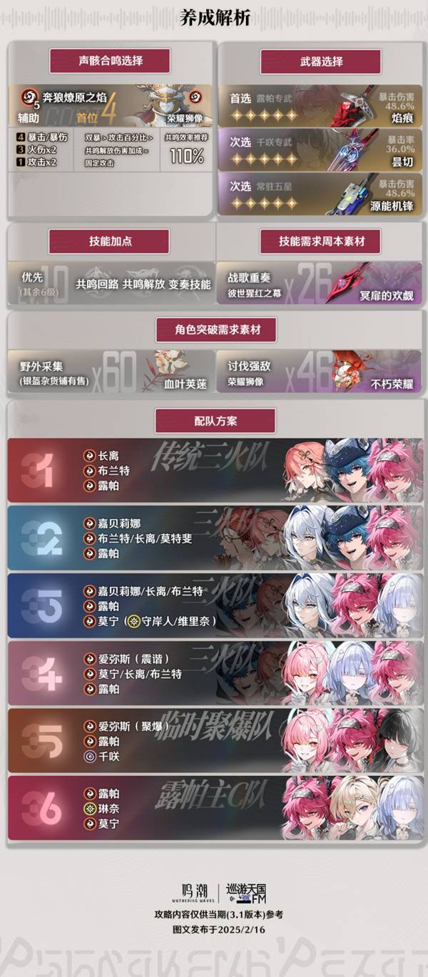 鸣潮3.1版本复刻了五星露帕,那么露帕要怎么培养,又该如何操作呢?下面请看为大家带来的鸣潮3.1露帕详细培养一图流,一起来看看吧。