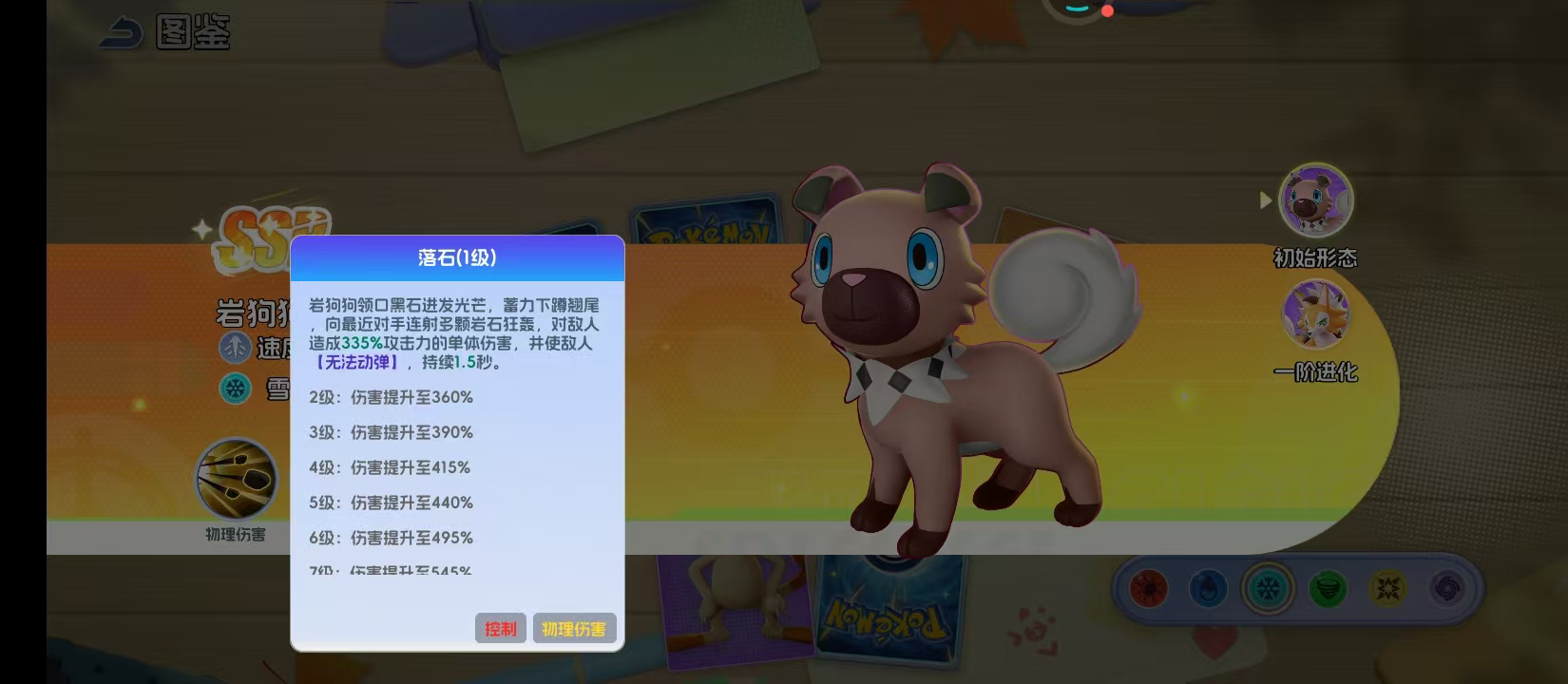 作为雪属性的精灵。岩狗狗定位其实还是比较清晰的,就是专门为了克制高攻击而生。初始的形态到一级进化,外形始终都会有一种野性的张力。那一双湛蓝色的眼眸就会锁定敌方攻击力最高的目标,这种设计并非徒有其表,而是和技能一直绑定在一起。核心技能就是落石这就是开场杀器,有爆发,还有控制能力,一旦在释放技能之后,就会造成最高495%的单体伤害。还能强制让目标陷入到1.5秒的无法动弹状态中,在PVP对战中,这1.5秒就可以改变战局。