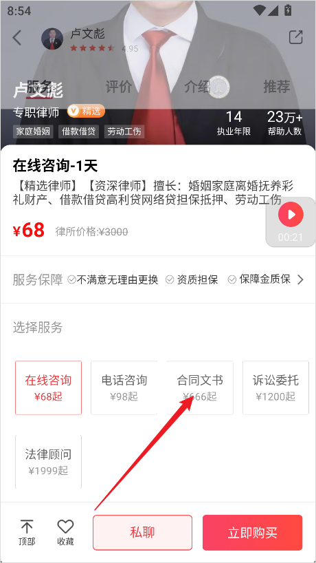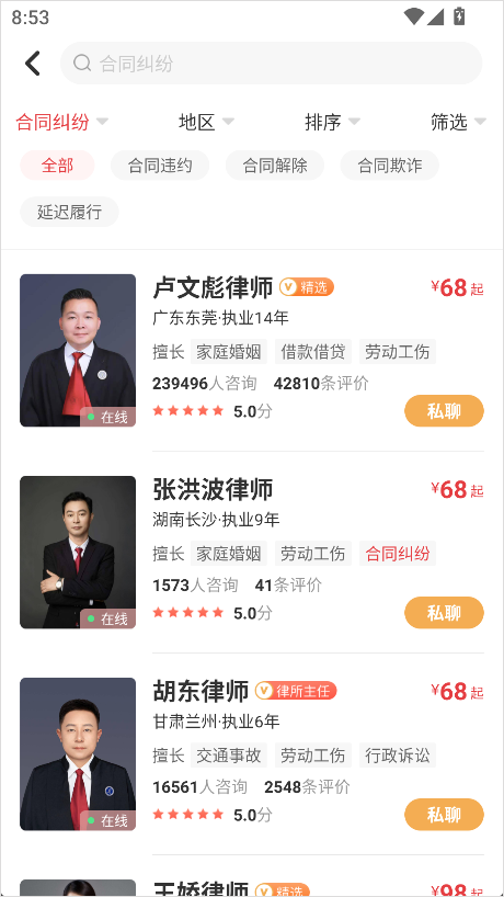 2、在这里,该平台提供了一些非常专业的律师供您根据自己的需求进行选择。