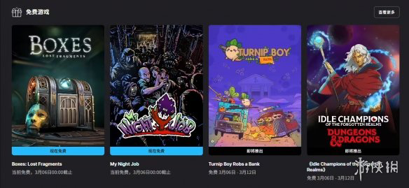 Epic本周限时免费送出《盒子:丢失的碎片》和《我的夜间工作》两款游戏,均支持中文,领取时间持续一周。下周免费阵容将更换为《大头菜小子抢银行》与《遗忘国度之闲置冠军》。