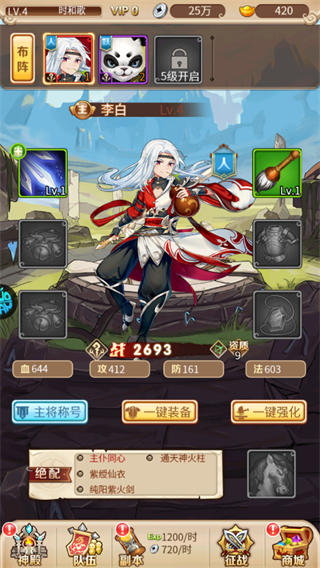 1、进入游戏后别急着推图,一边升级一边存升级时送的钻石,等存够了先去十连抽,必定获得紫色伙伴,这样加上刚开始送的主角李白和甲级熊猫阿宝,之后入手二个甲级伙伴在前期是非常强力的。