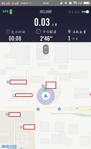 3、绿色图标显示您的位置(我在公园跑步时GPS信号较弱)。