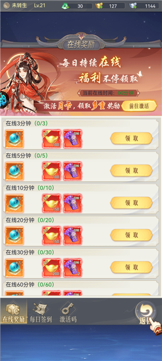 3、累计在线时长,可以领取元宝和召唤卷轴,上限时间为90分钟。