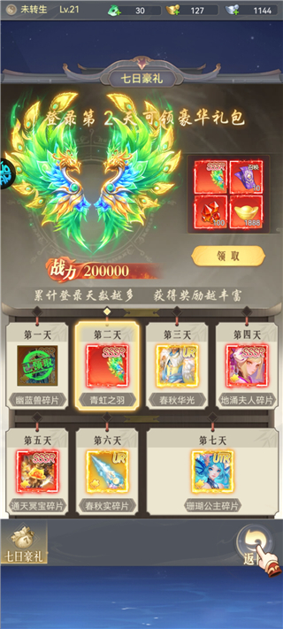 4、连续登录七天可以领取豪华装备、坐骑、翅膀、元宝等资源。