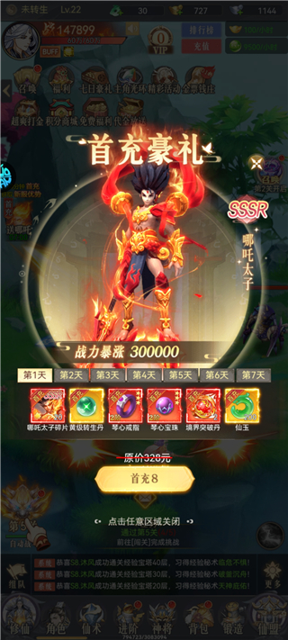 5、免费首充,领取6480的代金券后可以免费首冲获得SSSR哪吒,连续七天的内裤还能获得丰厚的奖励。