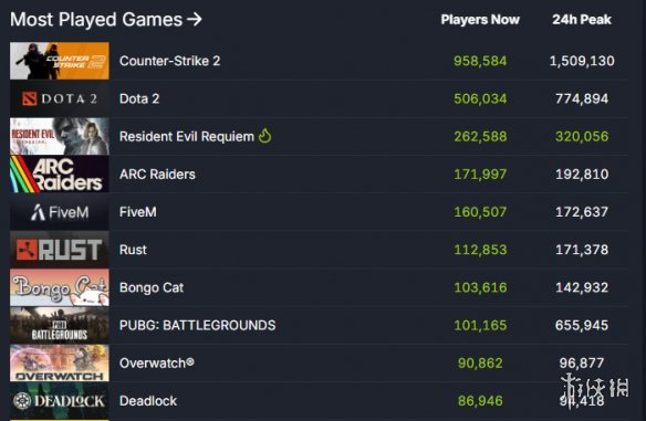 而在最新的SteamDB的最热门游戏榜TOP10中,《生化危机9》超过了最近热度颇高的多人游戏《ARC Raiders》,以26万人的在线人数,排名第三。仅次于《CS 2》和《Dota 2》。可以说是相当优秀。