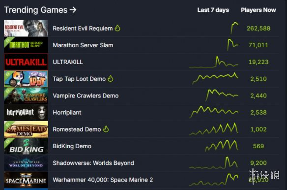 而在SteamDB统计的Steam热度飙升游戏榜TOP10中,《生化9》战胜了最近非常火爆的团队撤离射击游戏《失落星船:马拉松》,轻松夺得第一。