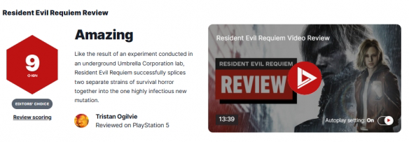 而一向以严厉苛刻的评分而著称的GameSpot此次也给了《生化9》8分(满分10分)的好评,认为本作将《生化危机》的公式提炼到了极致!稍显遗憾的是,游戏有点过度依赖怀旧元素与前作成功模式,略有重复旧套路之感 。